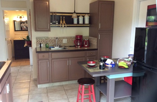 This charming little Mediterranean Garden/ Bungalow has 1/BR- 1/ BD - Living-room (w/ fold-out couch , plus Kitchenette with cute little