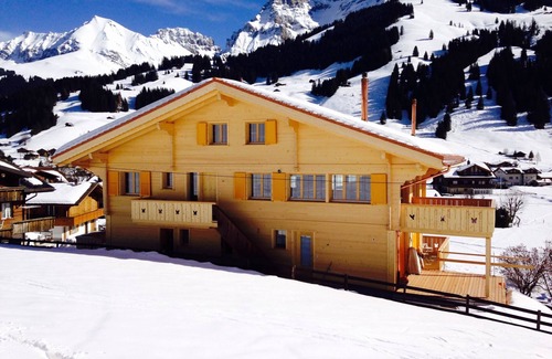 66 m2. More information by the provider: TOP POSITION in Adelboden. The chalet is situated directly at the famous Chuenisbärgli. Only 5 minutes away from the chairlift (Chuenisbärgli). The comfortably furnished 4-room apartment has a double bedroom and two single rooms for 4 people. Renovated bathroom with bathtub. Modern kitchen equipped with everything you need. Living room with sofa bed, dining table for 6 people, TV / DVD, radio / CD player and free Internet access (WiFi). Large balcony / terrace. Parking. Pets are allowed on request.
