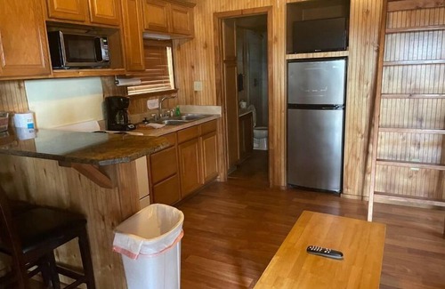 Cabin 11 at Tranquility Bay Resort includes: 1 Queen bed in private room, 1 loft with 2 full beds, 1 loft with full bed & twin bed. Sleeps 8.