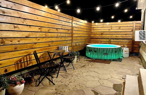 SIDE PATIO: located outside the bedroom with inflatable hot tub and dining area. PLEASE WATCH YOUR STEP! The steps are a little larger than normal. Be careful coming in and out.To take the lid off the hot tub press the safety lock in the middle down then both sides of the latch. You have to slam the screen door to shut it. Don’t worry you won’t break it. To turn on string lights use the switch by the hot tub connector.