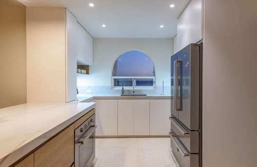 This beautiful, luxury high end, 2 bedroom ocean front condo is a perfect place to stay in Los Cabos! The rare ground floor, corner condo sits right on the beach. Condo features expansive ocean front views, luxury Italian natural stone and Italian major appliances, stove, large master ensuite, full in-condo private water filtration system, Irobot Roomba, full size laundry room, 65” TV, gorgeous solid wood dining table and bed frames, 100% white linen bedding with cotton sheets, down pillows and down comforter. Private terrace at ocean’s edge, wraps from master bedroom to living area, with sofa, chairs and BBQ to enjoy and take in ocean front living. Master bedroom boasts more ocean views with king bed, private TV and full ensuite. You can gaze at the most stunning sunrises from your cozy bed. Large guest bedroom provides king bed, and private TV. Additionally, guest bedroom has surf racks for secure and mindful surfboard storage. Surf or love to watch, Zipper's wave is right out front with a short stroll to La Roca or Old Man’s (Acapulito). Enjoy the luxuries and relaxation in this ocean front condo.