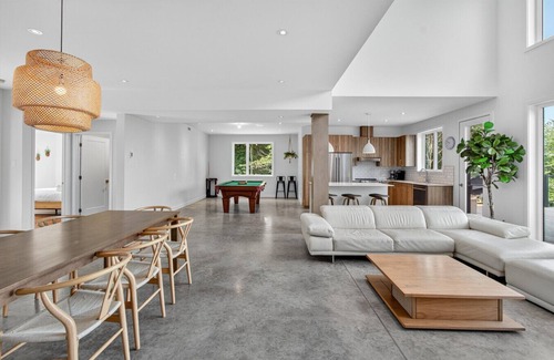 The fully equipped kitchen has high-end appliances including a dishwasher, Keurig Machine and cook-top stove. The dining area with a modern wood table and chairs offers the view of the outdoors.
