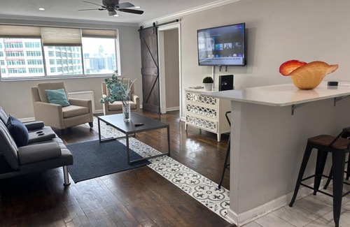 Experience luxury in this newly renovated 2BR/1BA condo on the 18th floor in Downtown Atlanta! Enjoy breathtaking city views, a queen bed, L-shaped sofa, smart TV, high-speed Wi-Fi, and a fully equipped kitchen. Amenities include 24/7 concierge, gym, onsite laundry, and Pool Access.