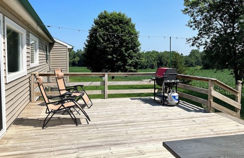Pineridge is waiting for you at this charming 2-bedroom house. Step inside to find a welcoming space with 1 king bed and 1 queen bed. This enchanting property also features a cozy living room with a sofa bed for extra guests. Kickback, relax, and enjoy everything La Porte and our house has to offer. Located on 70 acres of beautiful rolling prairie and farmland. Very private and secluded as the driveway is nearly 3/4 mile long. Master suite has a King bed, a garden tub for relaxation and a shower. Second bedroom has queen bed and tub with shower. Laundry room is also available with another 1/2 bath. Beautiful outdoor deck overlooking rolling hills with a comfortable pit group to relax on and a Weber grill for cooking your favorites. Deer, wild turkey, and wildlife are everywhere you look. The outdoor firepit is a perfect place to relax and stargaze at night. Located 5 minutes from Three Oaks, MI and 15 minutes from beautiful New Buffalo, MI. Wine Country is a beautiful 25 minute drive.