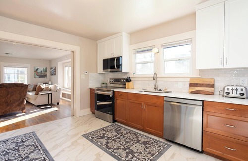 The bedrooms include one king bed, one queen bed, and two twin beds making it an ideal choice for families or groups of friends. On the main floor, walk from the newly remodeled kitchen with breakfast nook into a comfortable living room bathed in natural light. Enjoy your morning coffee in the enclosed sun porch while you relax in Adirondack chairs and watch the tree-lined sidewalks of the neighborhood wake up. There is additional living room space upstairs, with a couch, bean bag chairs, and Roku TV, along with two twin beds and a small library, game table, Pacman arcade game, and drawing desk. The property also includes a detached garage.