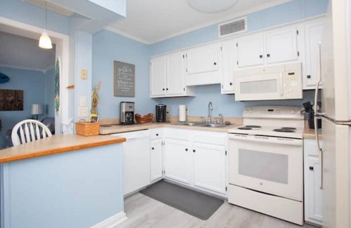 This beautifully decorated 2 bedroom/2 bathroom condo is great for guests of all ages! With unique decor and personal touches throughout, guests can enjoy their time inside when they'd like to take a break from the beach, ocean front pool, lazy river, or Quarter Deck!