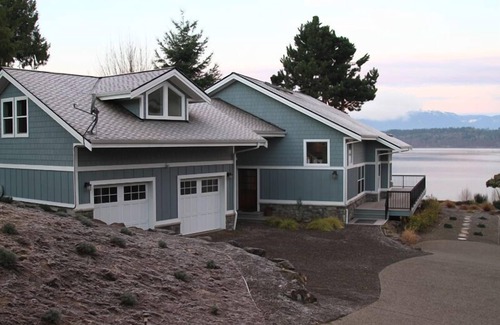 This spectacular home is perched on a bank overlooking Puget Sound and the Olympic Mountains. Enjoy the view from the large deck outside or from most rooms inside. The great room/kitchen with hardwood floors, gas fireplace, plentiful windows, granite counter tops, and state-of-the-art appliances enables constant enjoyment of the surrounding beauty. Three self-contained bedroom suites have queen beds, and two have views. An additional bedroom has two twins and a double bed next to a full bath. A large bonus room can provide additional sleeping space. Spend the day watching eagles soar, submarines and occasional sea lions, or walk the beach and harvest clams, mussels, or oysters (license needed). For more action, visit the charming town of Poulsbo, play some golf, visit a casino, hike at Hurricane Ridge, take a ferry from Port Angeles to Victoria BC, or engage in many other activities available in the area. This hideaway is the perfect vantage point for enjoying the Pacific Northwest