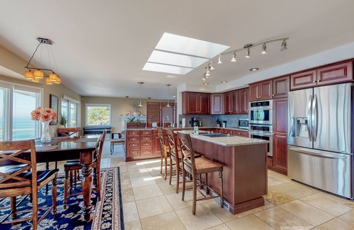 Beachgoers and outdoor enthusiasts will be thrilled by Whalerock Luxury Home! This lovely home offers guests privacy, expansive ocean and beach views, a large deck with outdoor seating, and all the amenities you could need to spend a carefree vacation. Inside, this vacation rental features an airy living area with comfortable furnishings, a large fireplace, a formal dining room, and a telescope for nighttime stargazing and daytime wildlife viewing, including whales, seals, migrating seabirds, and more. The kitchen is well-equipped and offers stainless steel appliances, modern utensils, marvelous granite countertops, and a convenient island. The large, brand new, six-person hot tub is the start of this house - it's sunken into the deck, which means you can relax and soothe your muscles while admiring the views. This residence is the top floor of the home. Downstairs, with separate parking and entryways, are Suite 1 and Suite 2. Both are high-end units of a luxurious two-story home and the other two units may be occupied, so please walk gently.