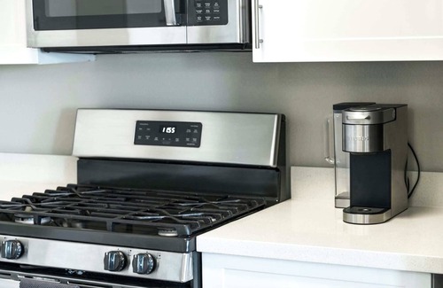 The kitchen comes with all your basic cooking equipment, dishware, silverware (bowls, plates, cups, etc.), a stainless steel refrigerator, microwave, stove, oven, toaster, rice cooker, and Keurig coffee machine.