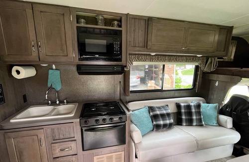 What makes our RV stand out? For starters, she's spacious and comfortable, with enough room to sleep seven. There's a cozy queen-sized bed in the master suite, a convertible dinette, a sofa bed, and multiple TV's. Our RV also features a fully-equipped kitchen, including a microwave, stove, refrigerator, freezer, air fryer, k-cup coffee maker; as well as a bathroom with a shower, toilet, and sink.