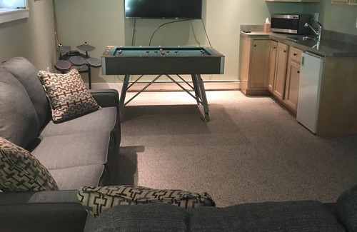 Clean comfortable four bedroom, 2 1/2 bath chalet located in the heart of the white mountains close to everything New Hampshire has to offer. Right off 93. Only five minutes to the town of Littleton and 15 minutes to the town of Lincoln . Close to hiking, skiing, snowmobile trails, golfing, Lakes, rivers, Fun Family attractions and a water park just to name a few. Layout is as follows : BASEMENT : walk out finished basement with Family room , (Equipped with a large flat screen TV bumper pool table DVD and Wii gaming system) Wood stove, Half kitchen, bedroom with a ( full bottom bunk, twin upper bunk and a pull out trundle bed ) full bathroom and washer and dryer. MAIN LEVEL: Open concept living area, Cozy Gas fireplace dining room, kitchen, bedroom (queen bed) and full bath. THIRD FLOOR: has two comfortable bedrooms one with a ( king bed ) and One with a (trundle style twin bed that converts to a king and also a separate twin bed ) and a half bath. All rooms are equipped with a flat screen smart TV and WiFi. Outside has a Large walk around deck and grill. The town also has a Community pool, Park, and basketball court. This property is perfect for any season! Great for a large family or a couple just looking to get away .