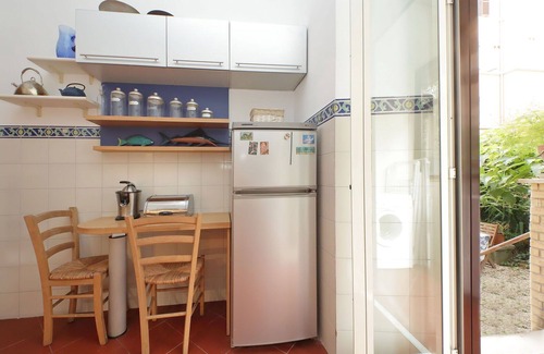 The kitchen is well equipped with refridgerator, oven, stove, microwave, cutlery and crockery for six people. The kitchen opens onto a small laundry room - equipped with a washing machine - and also to the garden.