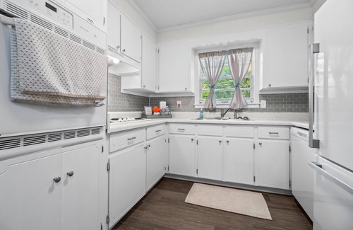 Two living areas, one with a 55" Smart Tv, full size sofa and leather recliner. 4 TV's Total! The other area is a smaller reading area or perfect to watch the news in the morning with two chairs and shared with the dining area that seats 6. Brand new WASHER and DRYER available to use! The kitchen is U-shaped and is equipped with all essentials you may need. Complimentary coffee bar offers both drip coffee maker and Keurig - Yes, Coffee, Sugar and Creamer is included! We have thoughtfully designed each space with comfort in mind, offering the best mattresses to sleep and plentiful reach for pillows and linens. The floors are laminate vinyl, providing a warm and cozy feeling. We have both a walk-in shower and a tub/shower combo! King bed, queen bed and two twin beds. The sunroom and front porch offer additional areas to relax in the private backyard to give the ultimate vacation feeling. The carport offers covered parking as well, if you choose!
