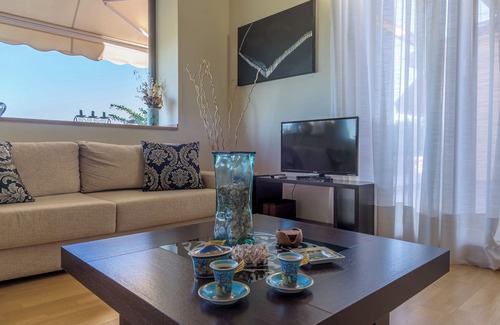 It consists 4 beautifully decorated bedrooms, two bathrooms with WC. An open-plan living room with 3 sofas, a dining area for 8 people and an equipped kitchen. The large hallway leads to the master bedroom, with its fantastic sea view, with the queen-size bed (180cm), a large built-in wardrobe. The second bedroom has a double bed. The third has two single beds and the fourth bedroom a single bed and a sofa/bed.