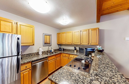 Step inside this comfortable condo and discover a ceiling of knotty pine set over an inviting living area with plush furnishings and a gas fireplace. Prepare all your favorite dishes in the well-equipped, full kitchen complete with a suite of stainless steel appliances and counter seating for quick bites or socializing with the cook. Dine together at the adjacent table or indulge in intimate alfresco meals out on your furnished patio.
