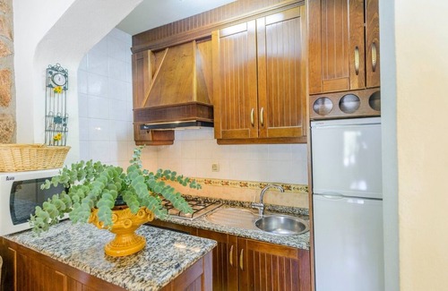 The two-storey house features a rustic decoration and, at the same time, it offers the equipment to provide you with a relaxing stay. The ground floor welcomes a cosy dining-living room, featuring a fireplace, comfortable armchairs and a sofa, that shares space with a lovely open kitchen. A bathroom with a shower and a bedroom with a double bed are also available downstairs.
