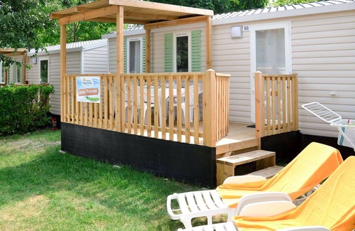 The mobile home offers various amenities to enhance your vacation experience. It features a shower/WC, air-conditioning (additional charge applies), a partly roofed terrace with outdoor furniture, an electric barbecue (portable), and two deck chairs. Furthermore, mosquito nets are provided, and there is a reserved parking space for one car.