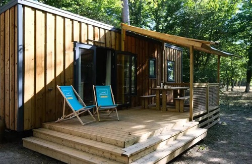Accommodation: The 2-bedroom Zen cottage has all the comfort you need to welcome you during your stay at the campsite. It consists of 3 bedrooms (one with 1 double bed and one with 2 single beds) and can accommodate up to 5 people. There is also a fully equipped kitchen and a bathroom as well as a semi-covered terrace.