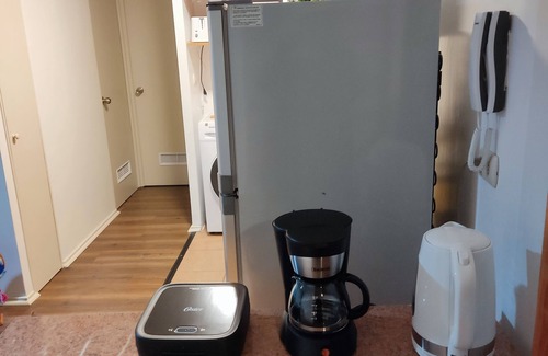 The kitchen is equipped with an oven, a stovetop, and a refrigerator, as well as a coffee maker, an electric kettle, and a lobster pot. Bathroom amenities include towels, toilet paper, and soap. And you can even pack a bit lighter because there's a washer and dryer. Other amenities include bed sheets, concierge services, heating, and a dining table.