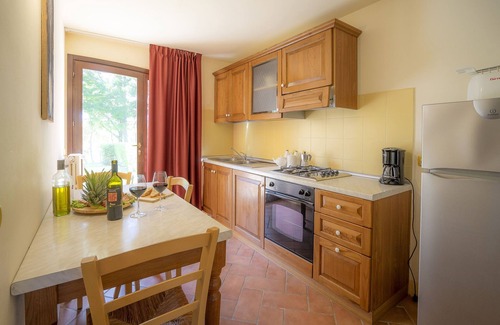 Layout: Ground floor: (Living room(double sofa bed, TV, air conditioning), Kitchen(oven, freezer, fridge-freezer), bedroom(double bed), bathroom(shower, toilet)) On the 1st floor: (Gallery bedroom(double bed)) washing machine(shared with other guests, paid), heating(central), terrace(private), garden(private), garden furniture, BBQ(shared with other guests), parking, swimming pool(shared with other guests, including separate children’s swimming pool (depth 50cm), opened from 1/2 Apr upto and including 1/2 Oct), tennis court, boules court, bicycles available