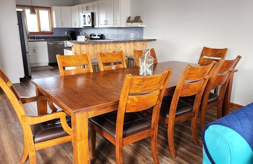 Twin Fin is well equipped for a comfortable vacation, perfect for families traveling with children or an adults-only getaway. The upstairs floor features two sitting areas, a large dining table (seats 8), 3-seat bar, and breakfast nook, along with a spacious kitchen and half bath. There is a large wraparound deck on this floor as well. The lower floor features four bedrooms- on one side of the hall is the King Master Bedroom and a Queen Bedroom adjoined by a jack-and-jill bath with a tub/shower combo. On the other side of the hall is a second Queen Bedroom and the Bunk Room, which features a twin bunk bed and pull-out trundle. Those rooms are also joined by a jack-and-jill-bathroom with a shower. There is an ocean-facing deck on this level as well.