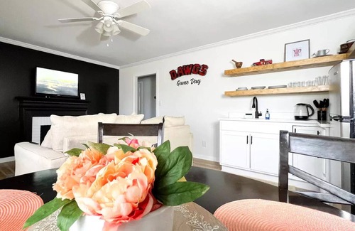 The property is a beautiful red brick southern ranch home surrounded by a spacious front and back yard. Your suite is on the further left side of the property. The one with the charming front open porch with two red chairs. Suite 101 welcomes you to a cute cozy full kitchen with a comfortable living room all in one place. As you go further into the property to the left of the hallway you will find the two bedrooms and a full bath. To the right side of the hallway, you will find the laundry room that excessively used for the cleaning crew. Don't forget to take your memorable selfie in front of the "DAWGS" vintage lights.
