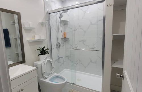 Your Chilliwack getaway awaits at this superb one bedroom unit . The cozy space features 1 king bed, and a living room with a comfy futon. Guests can unwind in the tranquil surroundings and make use of amenities like a hair dryer, AC, heating, and an iron. With a bathroom equipped with a hair dryer, this quaint retreat is perfect for a relaxing escape. Enjoy your time in Chilliwack at our house