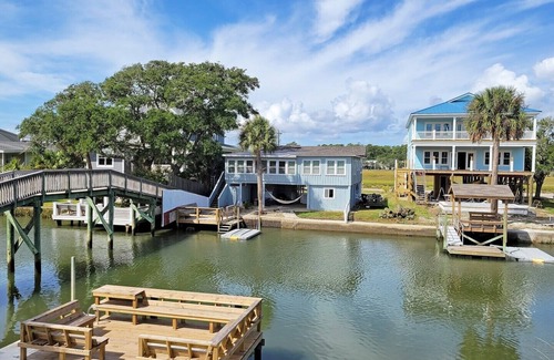 Located between creek and canal on the south end of Sportsman Drive, this home boasts beautiful saltmarsh views, a covered dock on the canal, and easy beach access via the canal footbridge.