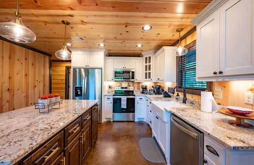 A starter supply of paper towels, toilet paper, bath soap, dish washing liquid, trash bags, dishwasher tablets, laundry soap, coffee, coffee filters (bring your own k-cups) , and salt/pepper will be provided for your stay. All cabins have fully equipped kitchens, hair dryer, iron/ironing board, towels, and linens.