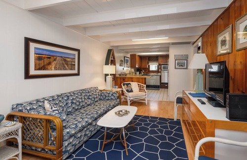 This pet-friendly beach cottage offers two bedrooms, one bathroom, and comfortably accommodates up to six guests. The bright, open living area flows seamlessly onto a screened porch, creating the perfect space for morning coffee or evening relaxation.
