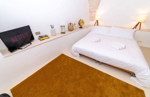 The recently renovated property is located in the heart of the historic center of Cisternino, in a quiet area away from nightlife. Upon entering the building, you'll find a staircase made of traditional local stone. Ascending to the first level, you'll discover a spacious sleeping/living area furnished with high-quality furniture and adorned with unique details. The space is equipped with a SMART TV, Wi-Fi, a comfortable single sofa bed, and an original white wooden platform on which the double bed is placed, adorned with distinctive exposed stone star vaults.