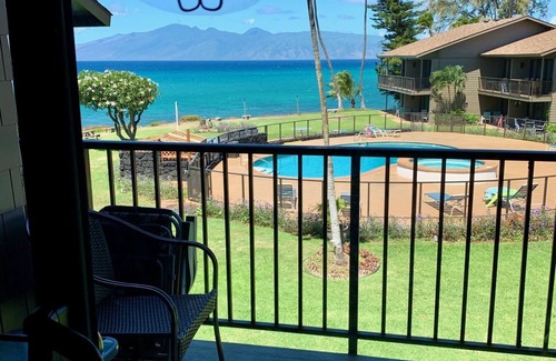 Our condo is roomy, vaulted ceilings gives you a feeling of openness..amenities include; a fresh water heated swimming pool, jacuzzi spa, free high speed wireless internet, cable, Smart TV, coin operated laundry facilities on site, and free parking. Enjoy our new cutting edge fully equipped bamboo and espresso kitchen, complete with granite counter tops, new appliances which include a double oven. Enjoy showering with the inlaid granite dolphins in our walk-in shower.. Condo's lush grounds are perfect for family vacations and relaxing getaways.. BBQ's are located next to the pool. As with any condo complex or hotel, all rooms/condo's here on Maui are not created equally, Our Condo Does Not border a street nor a noisy parking lot, and there is no escaping the ocean view, you are right there ocean front, the only thing between you and the ocean is the pool, no "garden view" or "Mountain Views" (other than the flowers around the pool, and the lovely Island of Molokai) If you love sunsets, turtle watching, whale watching (winter months) and stunning ocean views, this is the perfect spot for a memorable Maui vacation.