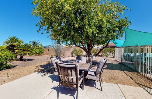From fitness to entertainment, there's something for everyone at this desert home, beautifully situated among palms, cacti, and orange trees in Sun City. Spend your mornings doing yoga in the home studio, your afternoons swimming in the backyard pool, and your evenings dining alfresco beneath starry skies.