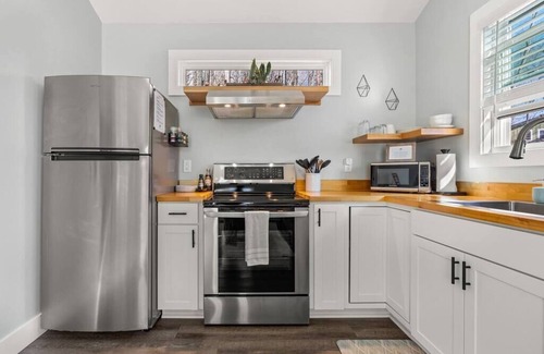 From this cottage, you’re less than a mile from pizza shops, Mexican restaurants, breakfast places, and a no-frills hot dog place. But on days when you want to eat at home, this fully equipped kitchen has everything you need. When you step into the contemporary kitchen, you’ll notice modern appliances like a refrigerator with Brita filtered water, a microwave, and an electric range with a vent hood.
