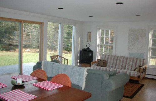 Dorsey Cottage is situated on a quiet cove that is just off the popular sailing lanes of Eggemoggin Reach (a mile wide body of water separating Deer Isle from the mainland). This picturesque cove wraps around two sides of the home, and provides for more expanded views northeast looking out across the cove and out to the reach. The home is set back from Reach Road, with a large pasture fronting the home, providing for a fully tranquil setting. Simply furnished, the interior provides for a somewhat modest and relaxed atmosphere. The kitchen, living and dining area are open, light and airy, and all gaze upon the surrounding natural beauty. The home has two bedrooms, one downstairs (queen) and one up (double), each with their own bathrooms. There is also a fold down futon in the living room for added sleeping. An open deck runs along the entire back of the home, and includes patio furniture. Both the living room and downstairs bedroom have sliding glass doors leading out to the deck. There is a covered deck on the front of the home overlooking the pasture. The setting is a kids paradise for exploration, but also a serene backdrop for adults to unwind and relax. Washer, dryer, TV will have a cable or satellite connection, VCR, DVD.