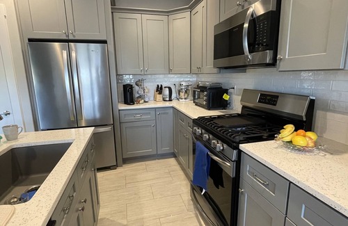 Kitchen is modern and well equipped for a comfortable stay. Combo air fryer, toaster, convection oven perfect for cooks! Gas stove with grill and quart countertops. Island with bar stool and table seats up to eight! Your choice of Nespresso or traditional coffee maker.