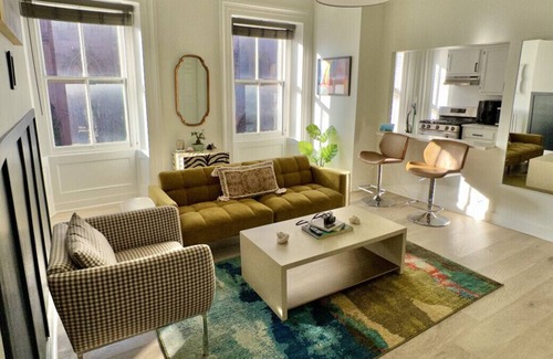 Kick back and relax in this calm, stylish space. This 600 sq ft. apartment is located in historic Mt. Vernon; a 5 min walk from the Peabody Institute and 10 min from the University of Baltimore and MICA. This cozy floorplan features hardwood floors, dimmable lights, smart home accessories, and amazing natural lighting. This space offers great views of the quiet neighborhood. This unit is ideal for traveling nurses, students, city visitors, or content creators looking for a trendy environment.