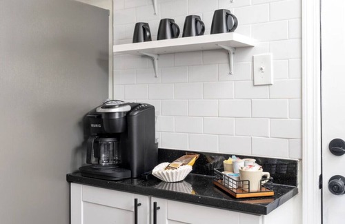 Guests may park on the street or in the parking pad in the back of the house. After entering through the front door and into the entry space, you'll find a calming living room with earth-tone colors and a 50” TV above the decorative fireplace. Past the living room is a colorful dining room with seating for four. In the back of the house is a newly-renovated kitchen with granite countertops, stainless-steel appliances, and a backdoor leading to the shared backyard and parking area. Down the stairs you'll find the laundry area, and upstairs you'll find the bedrooms and bathroom.