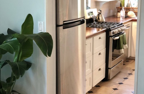 The kitchen has all stainless steel appliances, with cooking tools and dining ware. Here you’ll find a full washer and dryer set for getting the sand and salt out and a simple pantry for stashing the goods. The dinner table and dry bar are just over.