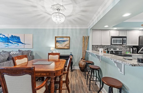 This privately-owned condo has a large kitchen with stainless steel appliances. The kitchen is fully equipped for the meals you want to cook in with nicer pots and pans. A Keurig coffee machine (and a few starter coffee pods) and the kitchen includes a little sitting nook for quiet mornings as the rest of the crew emerges from their restful night's sleep.