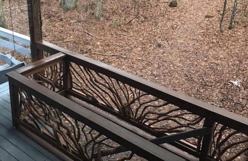 A split-rail fence welcomes you to "Treetops," a split level, architect designed, vacation home on the side of Black Rock Mountain in Rabun County, Georgia. Nearby there are endless opportunities for hiking, automobile day trips to fascinating places, fishing, antiquing, whitewater rafting, shopping, and just plain relaxing on the broad deck nestled up in the treetops.