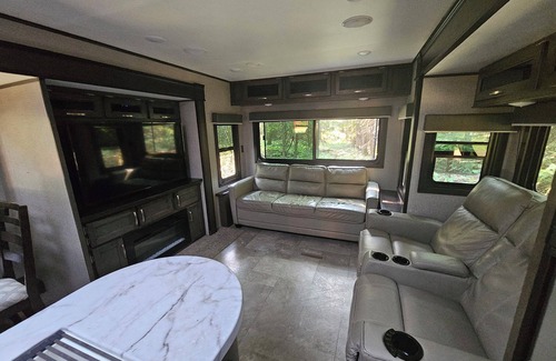Experience Clark Fork like a local in this 2-bedroom recreational vehicle. Perfect for a small group, this cozy space features 1 queen bed and 1 bunk bed, ensuring a comfortable stay. Powered by generator (propane provided), this is a true off grid experience that allows you to disconnect. With AC to keep you cool and a refreshing shower, guests can unwind after a day of exploring. Kickback, relax, and enjoy everything Clark Fork and our recreational vehicle has to offer. Refrigerator works great and a stove top with pans and utensils allow you to enjoy a home cooked meal if you choose. French press coffee maker with coffee provided. Enjoy a movie with 50" T.V. and DVD player in unit. Parking for 2 vehicles. Upon arrival instructions will be provided for generator operation and other amenities.