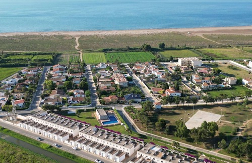 Urb. Eucaliptus 17 km from Amposta: Cosy, comfortable terraced house "Eucaliptus I", 2 storeys. In a quiet, sunny position, traffic calmed area, 1 km from the sea, 1 km from the beach, in a cul-de-sac. For shared use: natural state property (fenced) with lawn, 2 swimming pools angular fenced (14 x 7 m, depth 100 - 160 cm, seasonal availability: 01.Apr. - 30.Sep.) with internal staircase. Shower/WC in the pool area, children's pool, outdoor shower, poolhouse, pool maintenance by the owner/gardener. Private: terrace, garden furniture, barbecue. In the complex: WiFi, sauna, fitness room, air conditioning, washing machine, bicycles available. Parking at the house. Grocery 1 km, restaurant 1 km, bar 1 km, café 1 km, bus stop "Sant Jaume" 11 km, railway station "Aldea- Amposta" 25 km, sandy beach "Eucaliptus" 1 km. Nearby attractions: Parc Natural del Delta 2 km, Sant Jaume- Deltebre 11 km, Playa el Trabucador 6 km, Port Aventura 78 km, Barcelona 190 km, Tortosa 30 km. Hiking paths: Ports Tortosa Beseit 52 km, GR 92 30 km. Please note: car recommended. Suitable for families. Groups of teenagers on request only.