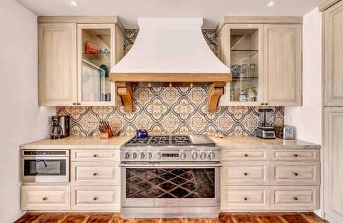 Fully-Equipped Chef-Style Kitchen: The villa's stunning, fully stocked gourmet kitchen features a 6-burner professional chef's gas stove with lighted vent hood, commercial Delonghi Espresso Machine, microwave drawer, side-by-side refrigerator, filtered water feature, and hand-painted tile backsplash. Not to be outdone, the downstairs has a wet bar with a wine fridge and tequila bar, and outside you'll also find a gas barbecue grill with a rotisserie.