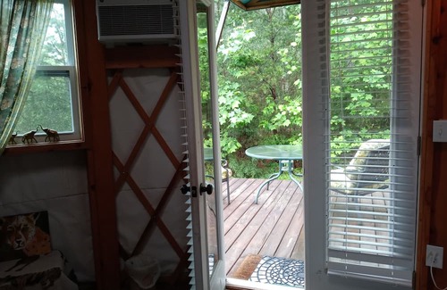 This darling yurt is only 10-13 minutes from beautiful Lake Lure and Chimney Rock, and including stunning master bedroom suite with a sumptuous king bed, heat, air, microwave, and mini fridge.IMPORTANT: keep in mind that it isa 2 minute walk to the main house for bathroom, kitchen, laundry. Can sleep up to 4 people if needed with additional double size futon mattress.