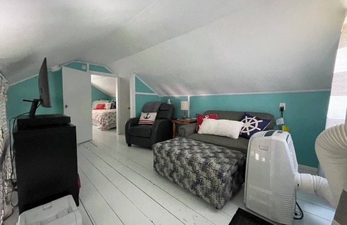 4k tv in the newly remodeled living room with blue-ray player. All furniture is brand new. Fully stocked kitchen with new dishes, silverware and cookware. The house contains one pull-out couch and one couch convertible (one in the living area, one in the loft), two twin beds (loft-bedroom) with wall-mounted DVD players and one queen bed (master). (One AC unit in loft bedroom and one AC unit on main floor.)