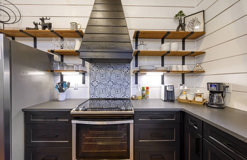 In the gorgeous kitchen, you'll find grey quartz countertops, stainless steel appliances, a farm sink, and an oversized island. The space even has an operational garage door window that opens to the back deck with a pass-through bar! We've provided everything you need to create delicious meals and drinks, including a full set of cookware, a crockpot, a blender, a toaster, and a coffee maker. However, with so many amazing restaurants in the area, you may be tempted to indulge in a night out.