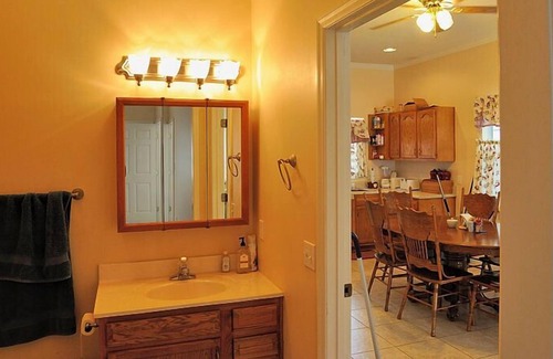 You can fly directly into this home as it has a 2600 ft grass runway. Bedroom one has a king size bed and a futon that can sleep up to four people. Bedroom two and three have queen size beds. On the front porch there is an additional futon. There are two bathrooms one that has a tub and shower and the other with a shower only. A fully equipped kitchen with all pots and pans and dishes. A screened in porch that is part of living quarters. Satellite TV and free WiFi. All linens are provided. A/C and heat. Outdoor BBQ. Fishing pond. Movies, books, and games.