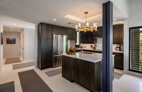 The highlights of our villa is firstly, the wraparound lanai that has perfect sunset views that span 120 degrees from over Ulua Beach to the pool and enjoy perfect privacy. Our villa is located at the front of the front row of Elua Resort. The second feature of our villa is our modern and expansive kitchen that is open to the living room and dining area. Everyone is connected no matter where you are in Villa 1002, whether on the lanai or in the living room or dicing fresh vegetables, everyone can remain connected to one another.