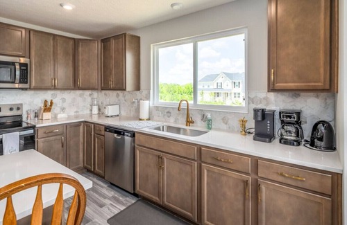 This brand-new home has lots of beds and amenities for families and medium-size groups! There is a kid's bunk room with toys, games, and smart TV will entertain the kids for hours. Parents and adults will be able to relax in luxurious bedrooms with king and queen beds. There is a fold-out futon in the king room for an extra sleeper. They can then visit and entertain in the fully furnished living space, with reclining furniture. The fully equipped kitchen will be a pleasure for preparing delicious meals! Portable pack-and-play crib and high chair are available for infants.